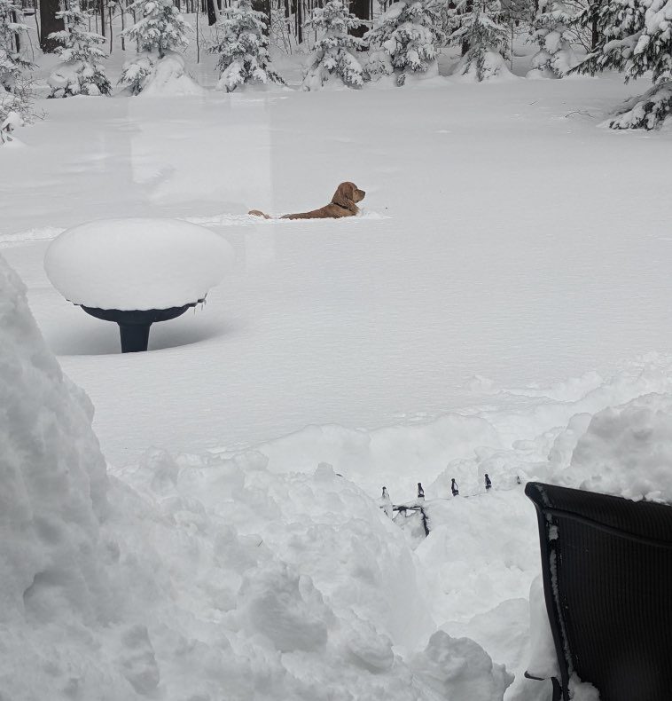 14. “Собака совершает очередной заплыв в снежном море, которое всего за одну ночь появилось у нас во дворе. Он проложил себе дорожку и вот уже 15 минут просто сидит там и смотрит в лес.”