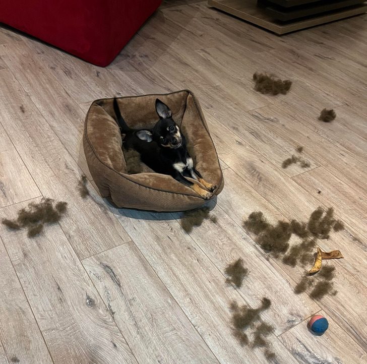 «Мой начальник уехал в отпуск и попросил присмотреть за его собакой. Пришел сегодня к нему домой и увидел это. Собака так горда проделанной работой!»