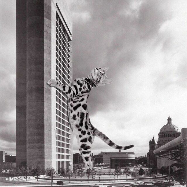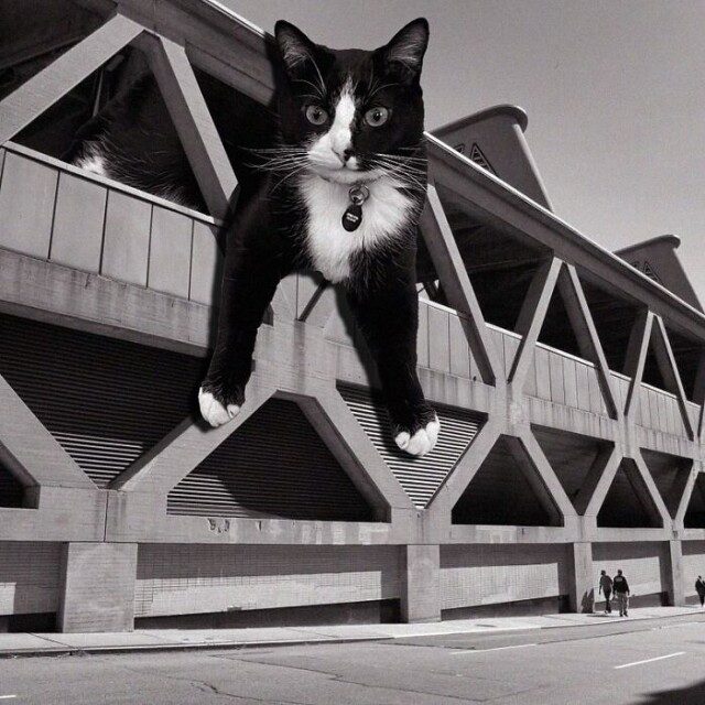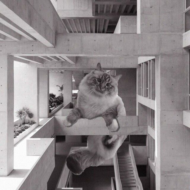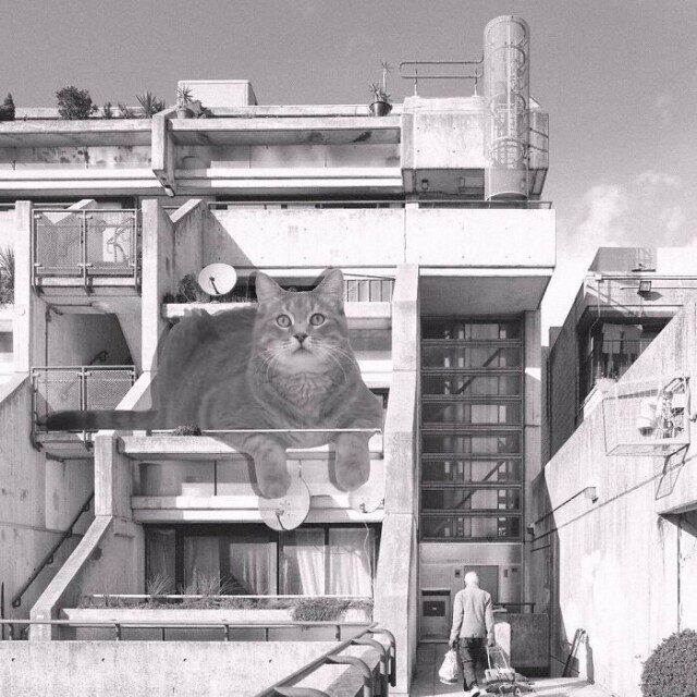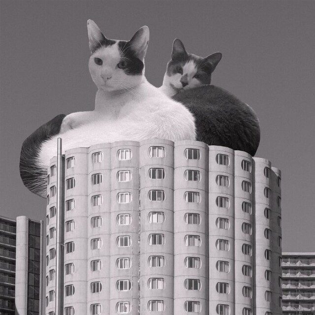 Грубая фактура и сложные формы в сочетании с мягкими и пушистыми существами — вот как можно было бы описать эти фотоманипуляции Эмили Баттальи (Emily Battaglia), Мэделин Онг (Madelaine Ong) и Микаэлы Сенай (Michaela Senay), основательниц аккаунта под названием «Кошки брутализма»(«Cats of Brutalism»), позиционирующего себя как «ежедневная доза кошек и бетона».