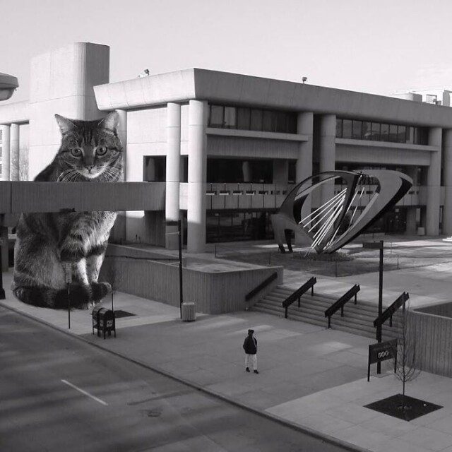 «Кошки брутализма» — это сопоставление бруталистских зданий и сооружений с гигантскими кошками, чтобы привнести мягкость, тепло и причудливость в часто воспринимаемые суровыми, холодными и жёсткими формы брутализма.
