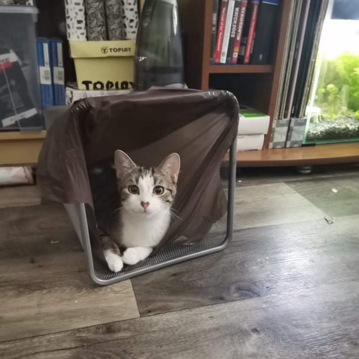 1. Опрокинул мусорную корзину и сделал из неё для себя домик