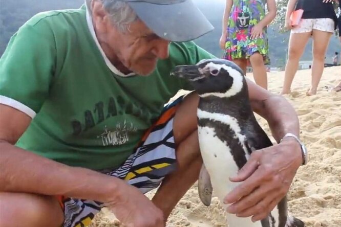 «Я люблю этого пингвина как собственного сына и верю, что и он любит меня, — говорит Жоао. — Он никому не позволяет к себе прикасаться кроме меня. Он клюется, если до него дотрагиваются. А у меня он лежит на коленях. Я купаю его, кормлю сардинами и даже держу на руках».