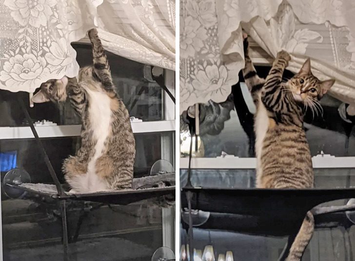 «Но я виню того умника, который прицепил кошачью лежанку прямо под причудливыми кружевными шторами».