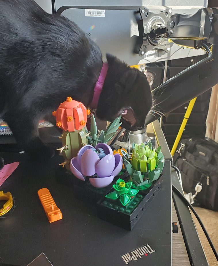 13. Видимо, кошка не еще не поняла, что эти растения в горшках сделаны из деталек Lego и поэтому настойчиво пытается их сожрать