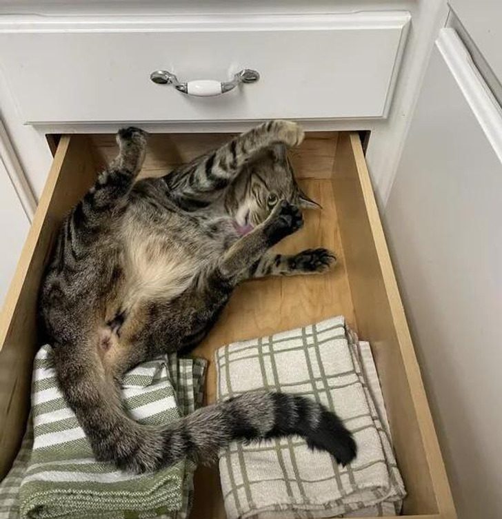 «Я: просто пытаюсь сложить чистые кухонные полотенца. Мой кот: