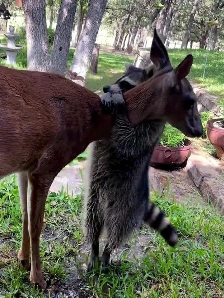 9. Иногда дружба сводит вместе очень разных животных. Например, енота и олененка.