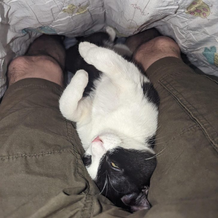 «3 часа ночи. Сплю и чувствую, что прямо между моих ног что-то шевелится. Испугался до ужаса. Поднял одеяло и понял, что это кот уютно устроился и посапывает»