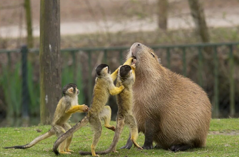 А звери к пушистому пацифисту тянутся как на магнит. Ведь капибара для окружающих животных крайне полезна. В случае опасности грызуны предупреждают друг друга, а заодно и всех потенциальных жертв в округе. К тому же водосвинка — это не только обед для хищников, но и шведский стол для насекомоядных. Обезьяны и птицы облепляют капибару, как только та выходит погреться на суше. Они проводят грызуну спа процедуру, поедая паразитов с шерсти. А тот и рад.