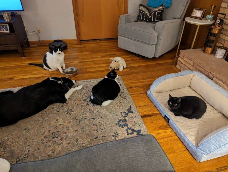 “У этих пушистых бандитов три гамака, четыре башенки и неограниченный доступ ко всем диванам в доме. Но самое лучшее место для них — это лежанка собаки.”