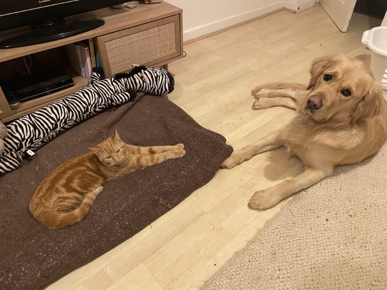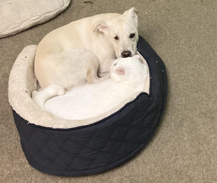 “Обычно пес, когда видит кота в своей лежанке, пытается его оттуда выгнать. Но в этот раз он просто лег рядом.”