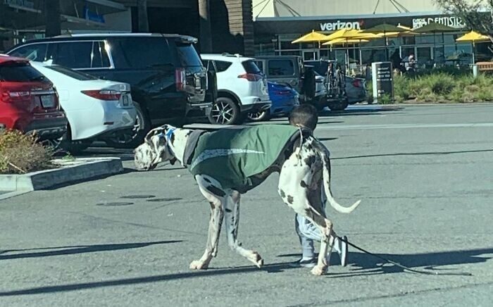 Мальчик просто выгуливает своего пса. Или пёс выгуливает его