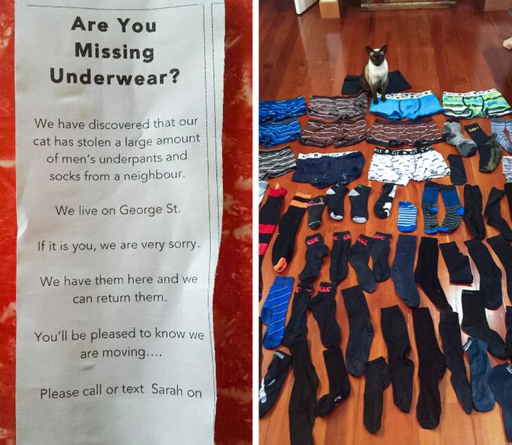 Недавно мы узнали, что наш кот крал мужские трусы и носки из соседних домов.