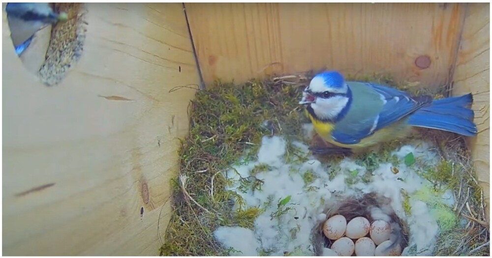 Камера наблюдений, установленная в птичьем домике, запечатлела необычную сцену. Пернатый чужак залез в гнездо и решил сделать что-то нехорошее. Птица позвала самца и вместе они прогнали негодяя.