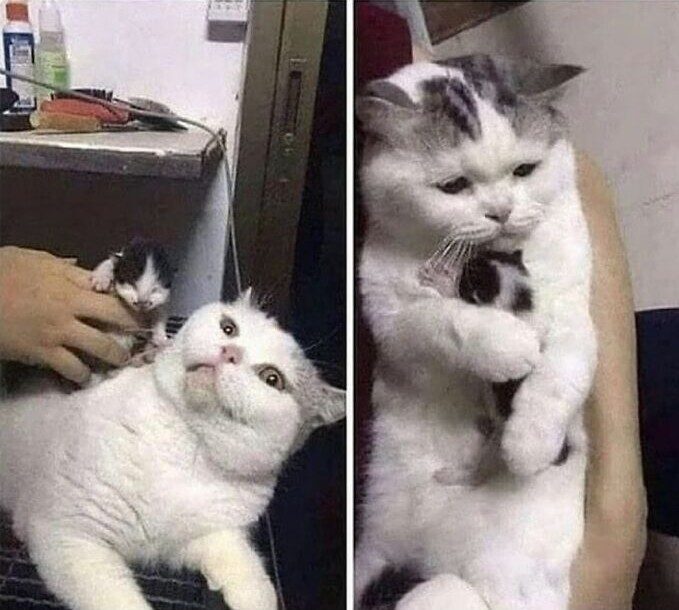 Спасённую кошку недавно стерилизовали. Но вот как она, несмотря на это, отреагировала на маленького котёнка-сиротку с улицы