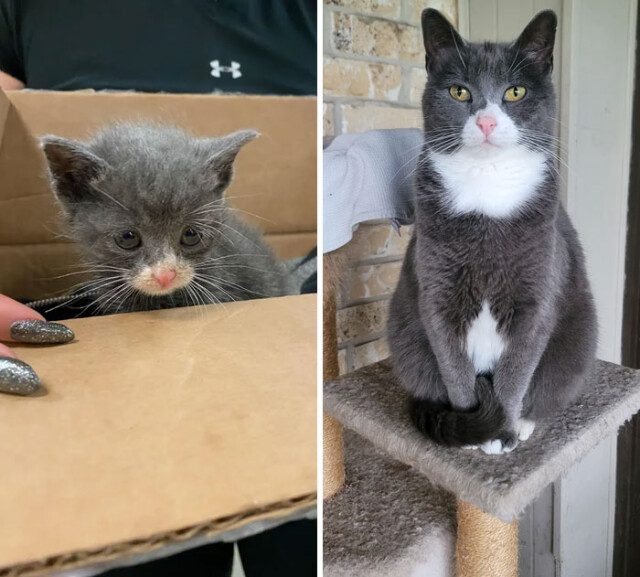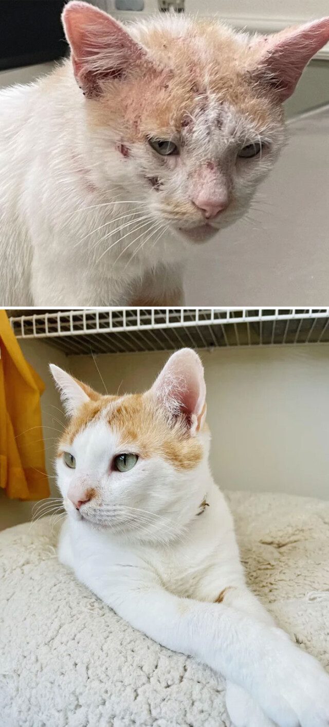 Фотографии спасённых кошек до и после того, как они обрели дом и любящих хозяев