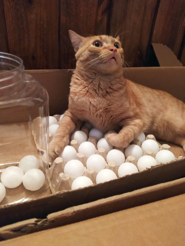 «Наш котяра все время так и норовит улечься на коробки с яйцами. Мы решили его провести и подложили ему в коробку для яиц шарики для пинг-понга»