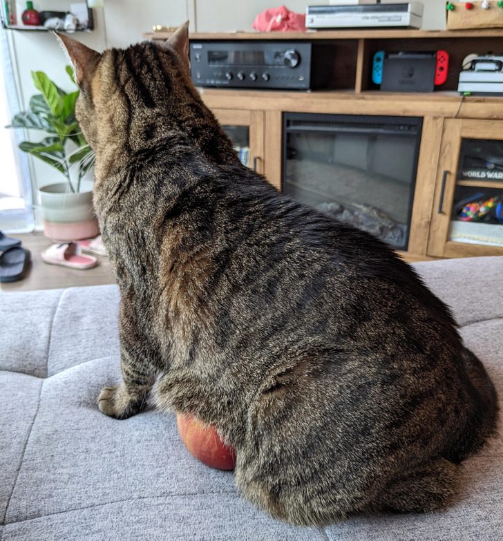 Кошка сидит на яблоке так, будто это яйцо, которое она снесла