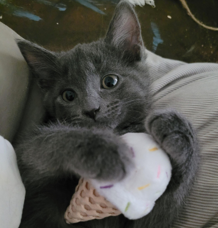 «Я подарил моему коту новую игрушку. Он очень рад, что будет с ней играть»