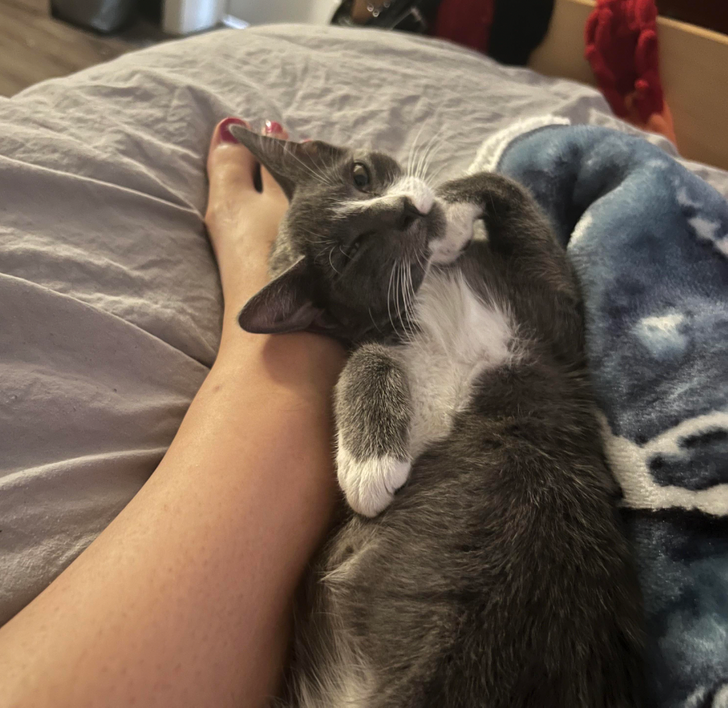 Вот так этот пушистый зверь показывает, как сильно он любит кататься по кровати