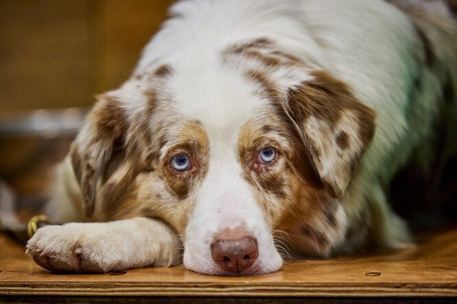 Австралийская овчарка (аусси) считается одной из самых красивых собак благодаря своим выразительным глазам, которые могут быть как голубыми и зеленоватыми, так и янтарными, и роскошной шерсти с уникальными разноцветными узорами. Популярные окрасы аусси: мраморно-голубой, мраморно-рыжий и черный.