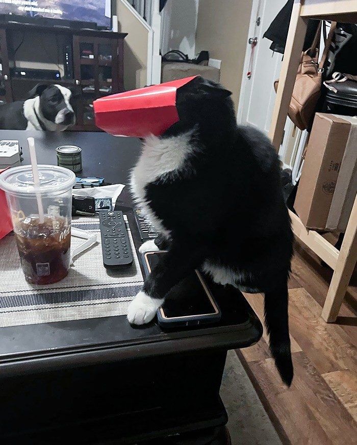 6. «Этот разбойник застрял головой в банке с лакомством (сублимированная курица), и теперь выглядит как демон»