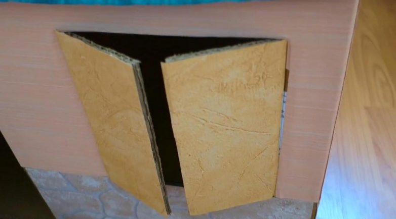 Боковые «крышки» подгоняем под соединенные части, чтобы по бокам не было дырок или торчащего картона. Это можно сделать с помощью карандаша: прислоняем их к основе и проводим карандашом по месту соединения.