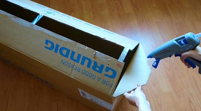 На противоположной стороне коробки делаем тоже самое. После чего, используя клеевой пистолет, промазываем клеем места соединения полученного треугольника и основной части будущей крыши. Хорошенько прижимаем и держим, пока клей слегка не прихватит картон.