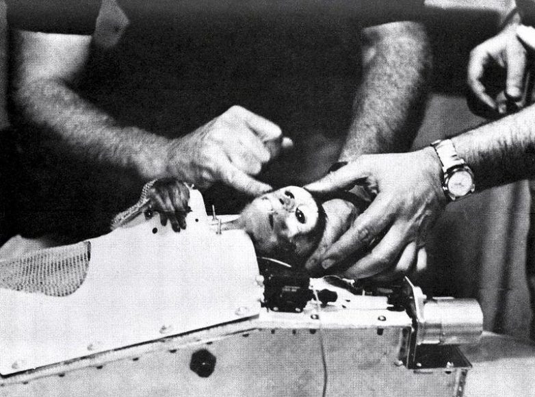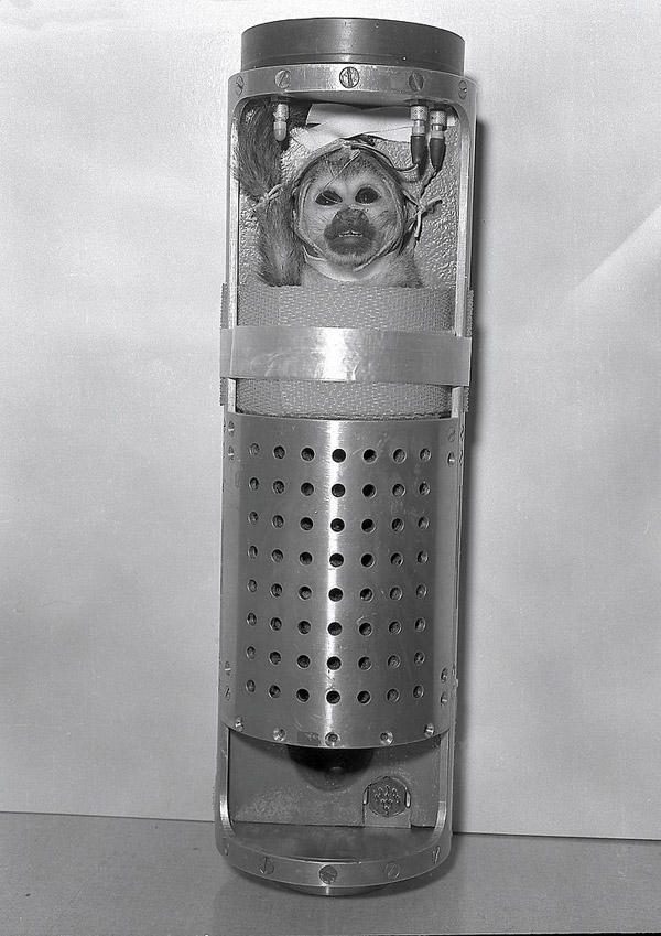 28 мая 1959 года макака Эйбл (на фото вверху) и беличья обезьяна Бейкер были запущены на 480 километров над поверхностью Земли на борту ракеты «Американский Юпитер». Из их «каюты» в носовом отсеке они благополучно вернулись на Землю, однако Эйбл скончалась из-за введения анестезии через несколько дней, когда врачи пытались снять электрод.