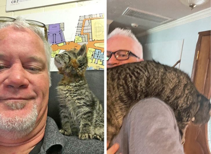 «Он мяукал и выглядел таким несчастным!» — поделился спустя время Хоули. Он осторожно начал отделять его лапки от асфальта. Передние лапки снялись легко, но задние были прилеплены накрепко, поэтому Чак отскоблил клей от дороги и поднял малыша вместе с клеем.