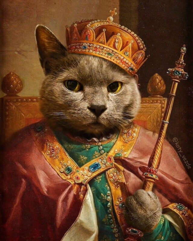 Представьте себе своего питомца в образе королевы или короля на классической картине — именно это и делает Галина: она берет старые картины и меняет людей на кошек.