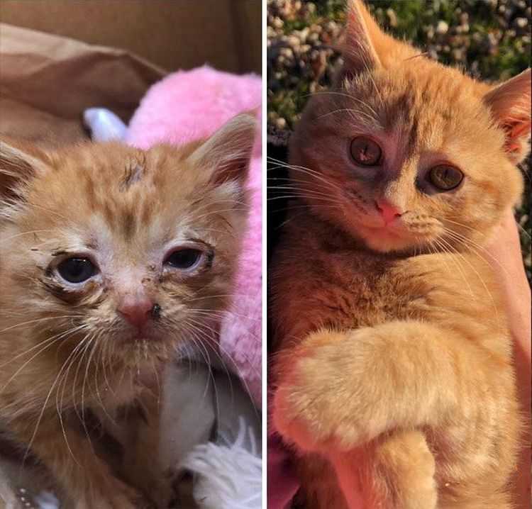 «Я нашел этого котенка, брошенного посреди дороги, слишком слабого и голодного, чтобы добраться до безопасного места. На фото справа показано, на что способны 6 дней обнимашек у камина, много еды и уютная кровать»