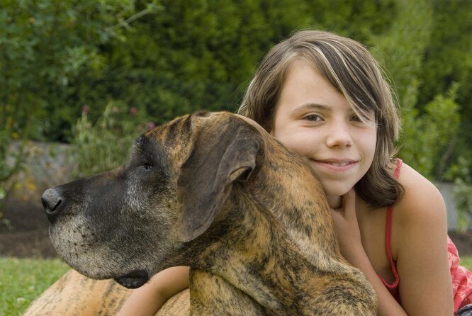 Эта собака чуть ли не самая большая из спокойных пород собак. Но при этом дружелюбная, надежная и безопасная для детей. А ещё у неё большое сердце. Немецкие доги привязываются к своим хозяевам, хорошо ладят с другими собаками и домашними животными и, как правило, хорошо воспитаны.