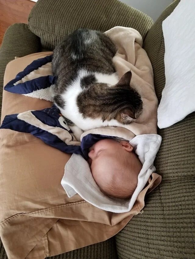 Кот считает себя ответственным за нашего малыша