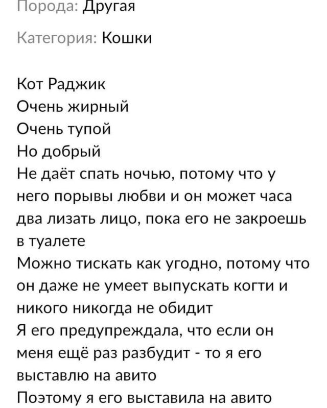 Тупой, жирный и очень ласковый. Пожалуй, это самый замечательный набор качеств для идеального котика. Но где же такого найти? Возрадуйтесь, питомец мечты существует, но стоит аж… миллион рублей. Этого красавчика зовут Раджик. Да, ценник, вероятно, немного завышен. Но разве можно жадничать, когда речь идет о таком прекрасном котике? Надо брать.