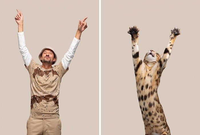 Фотограф проделал большую работу — провел кастинг, отобрав для съемки и котов, и людей. Было бы, конечно, здорово, если бы на двойных портретах были хозяева кошек со своими питомцами, но это не так. На самом деле это модели, которых пришлось долго и тщательно искать. Но результат, безусловно, того стоит.