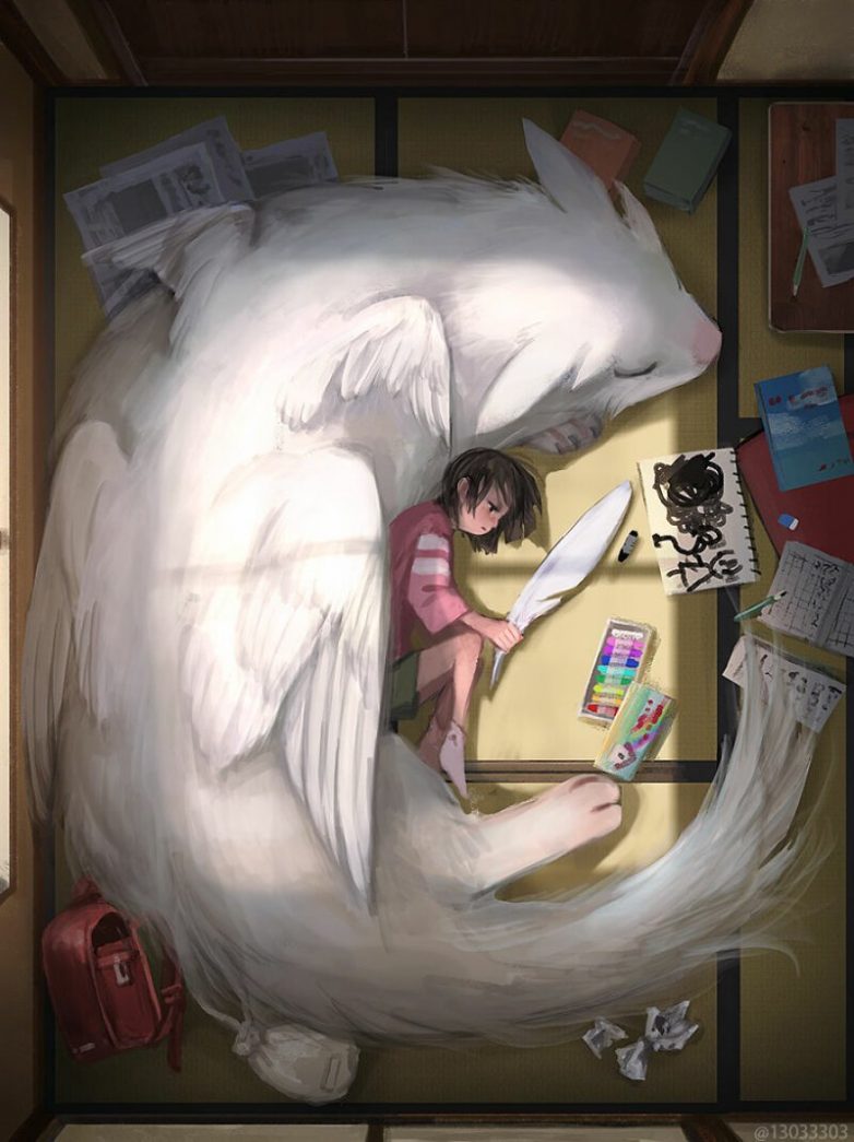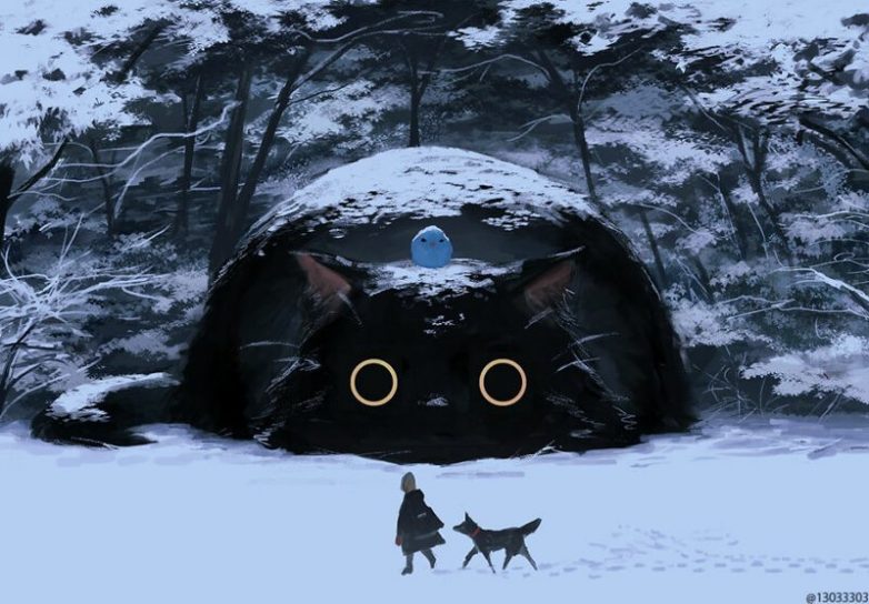 На такие работы ее вдохновила Студия Ghibli и ее мультфильмы-аниме «Принцесса Мононоке» и «Тоторо». Атмосфера на рисунках неземная, и картины раскрывают зрителям удивительный внутренний мир художницы, в котором домашние питомцы выступают в роли великанов и оберегают хозяев.