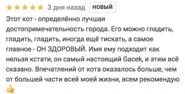 Уличный кот Гацек год назад считался самой настоящей достопримечательностью Щецина. Туристы находили животное по гугл-карте, чтобы его погладить, покормить и сфотографироваться. После этого кот получал оценку 5 баллов. Средняя же оценка никогда не падала ниже 4,5. Очень быстро его рейтинг обошел по популярности другие туристические места города.