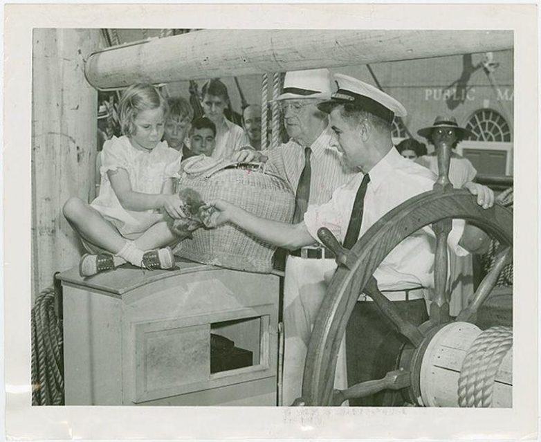Семилетняя Робин Такер дарит котенка экипажу корабля на Всемирной выставке 1939 года.