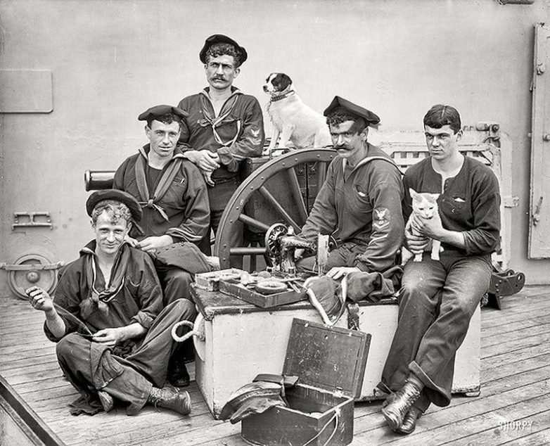Экипаж броненосца «USS Texas» с котенком и щенком – талисманами судна, ок.1900 года. «Техас» заработал довольно печальную репутацию невезучего корабля, и моряки, видимо, надеялись принести на борт удачу в виде этих очаровательных четвероногих членов экипажа.