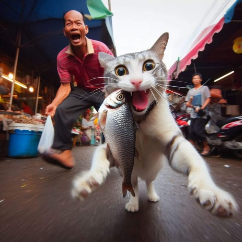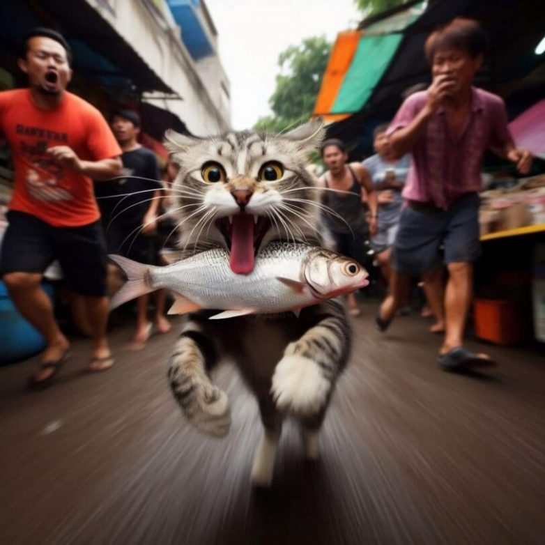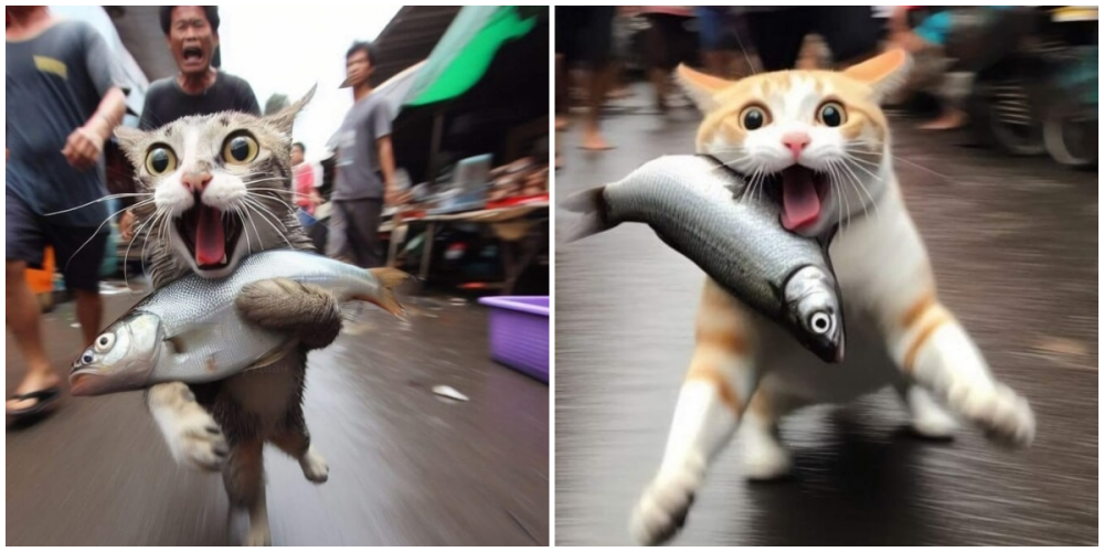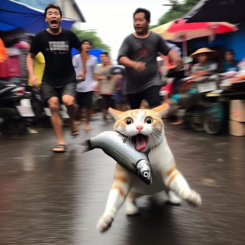 Пользователи сети попросили нейросеть нарисовать котиков, которые тащат рыбу. Нейросеть нарисовала изображения по запросу «Рыбные воры» и вот что получилось.