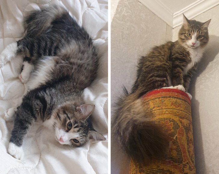 «Тогда это был котенок-подросток, месяцев 4-6, теперь — большой долговязый котофан. Очень ласковый, но все равно хитрый и своенравный».