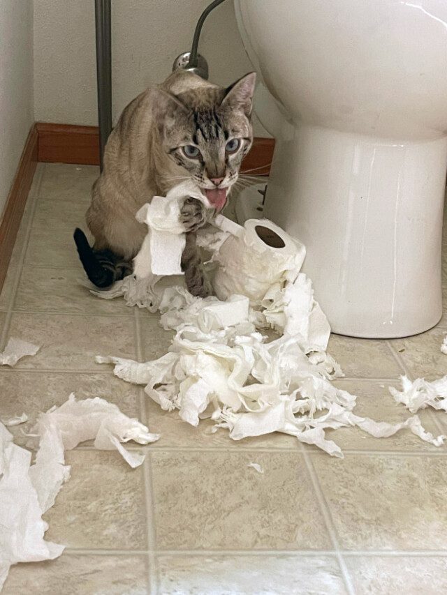 Чтобы отучить кошку от такого поведения, держите дверь в туалет закрытой, используйте закрытые держатели для туалетной бумаги или предложите ей альтернативные игрушки и занятия, чтобы она могла развлечься.