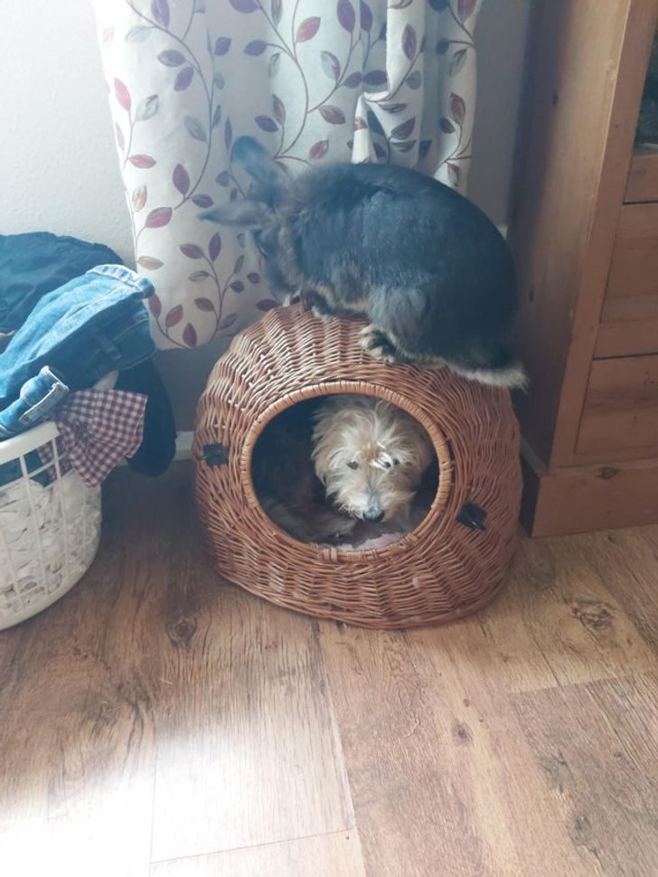 Кошка украла у собаки ее новую кровать и не собирается отказываться от нее
