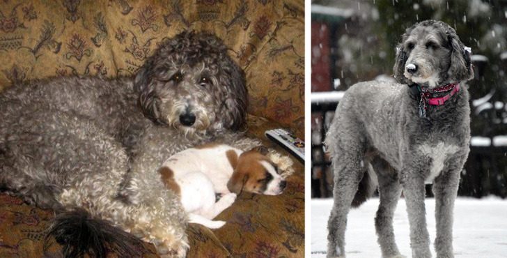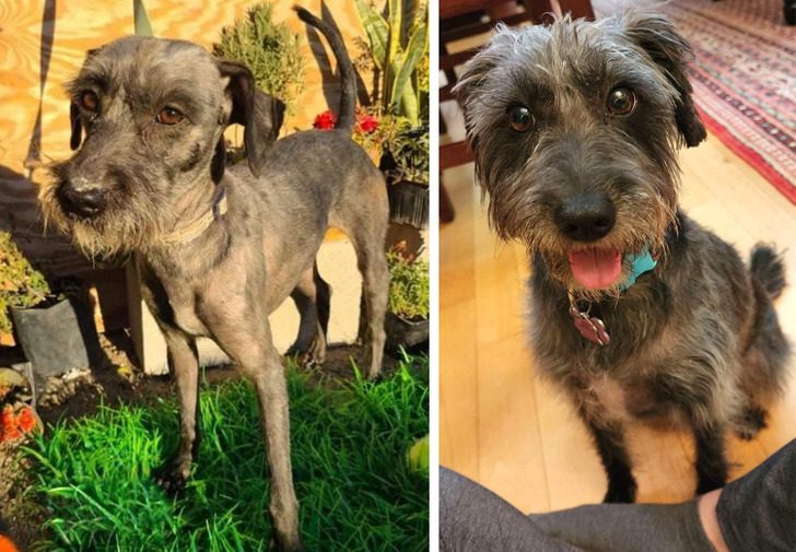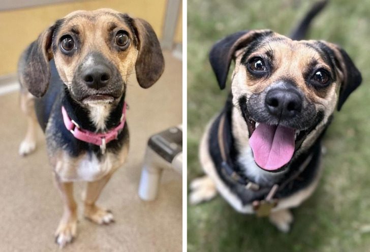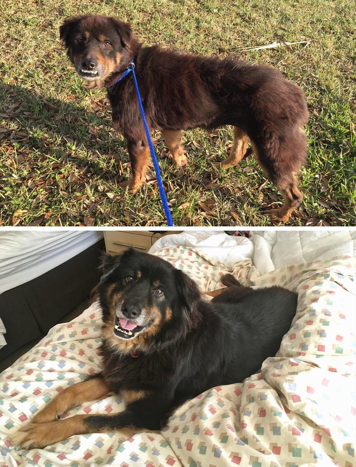 «Первые минуты дома, когда я только привела собаку с улицы и помыла ей лапы, и фото 3 года спустя. Это самая адекватная собака в моей жизни!»