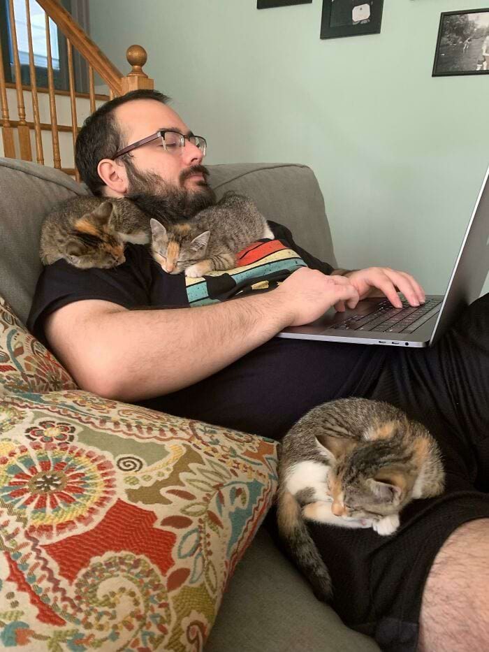 «Мой муж играет в игру, которую он называет „королем кошек“, и пытается удержать всех троих наших мальчиков одновременно… Сегодня он добился успеха»