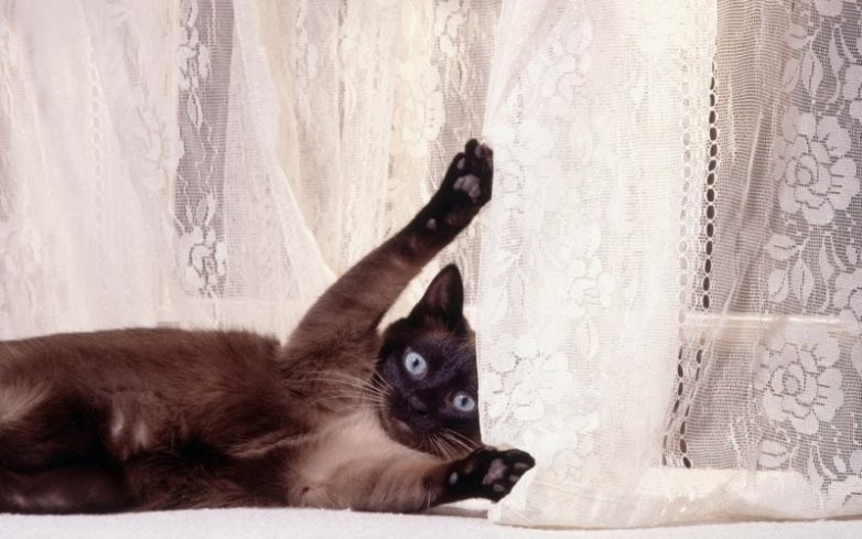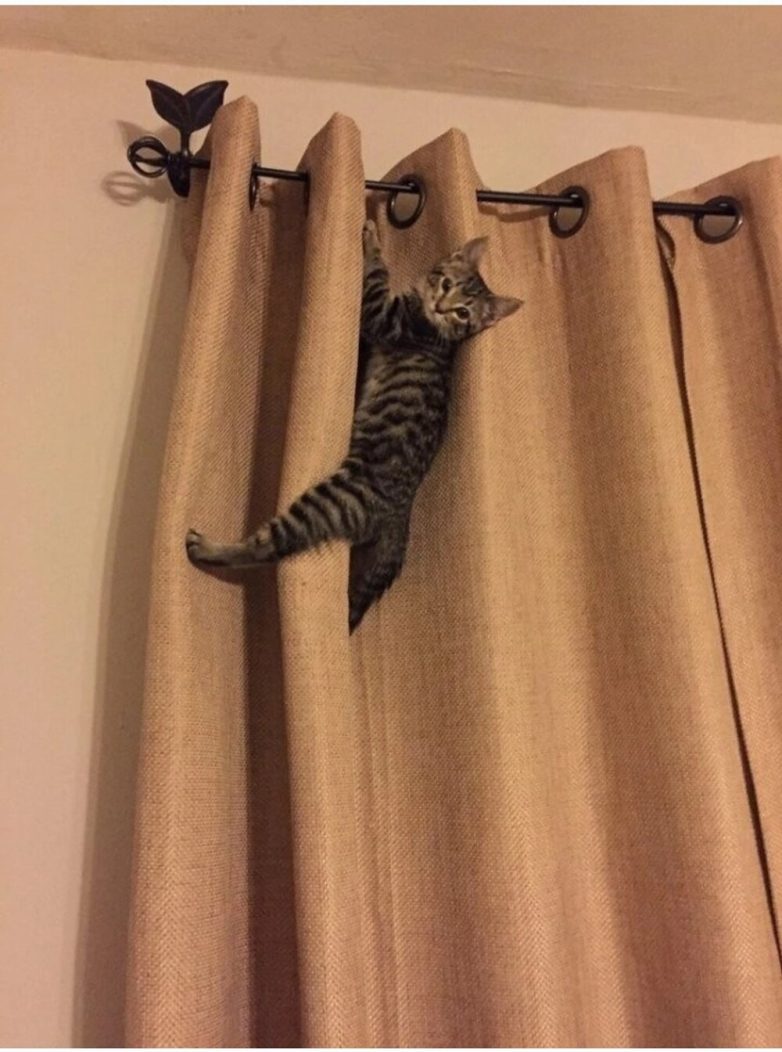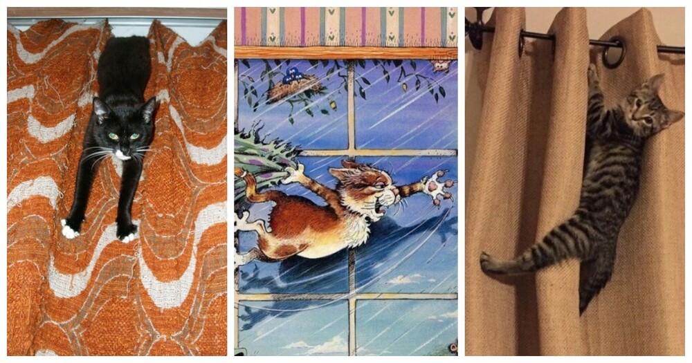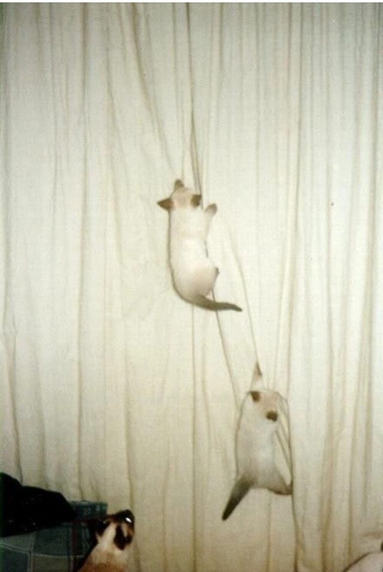 Но не только этими функциями славны декоративные занавеси. По ним можно лазить, на них можно кататься, меняя вид и эстетические характеристики. С этим на ура справляются хвостатые акробаты-дизайнеры, которые знают толк в быстром, ловком и креативном декорировании штор.