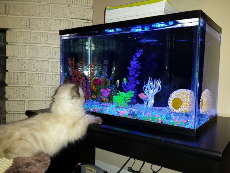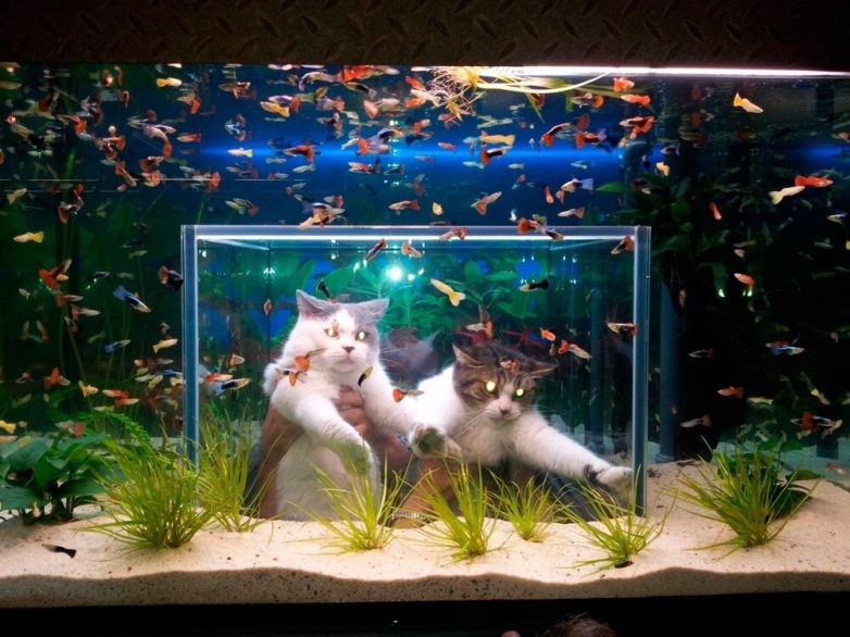 Наблюдение за рыбками и другими подводными обитателями и уход за ними помогают гармонизировать мысли и справиться с тревогами. И не только людям. Когда они заняты своими важными делами, вахту несут котики. И делают это с таким усердием и старанием, что конструкторы даже новый тренд запустили – аквариум с отверстием для кота. Для полного, так сказать, атмосферного погружения в завораживающий подводный мир.