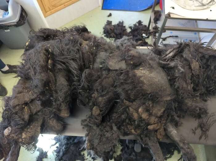 Поскольку ситуация была ужасной, Барни отвезли к ветеринару, где ему ввели успокоительное. Грязная, спутанная шерсть была сбрита с тела собаки и весила целых 7,8 кг!