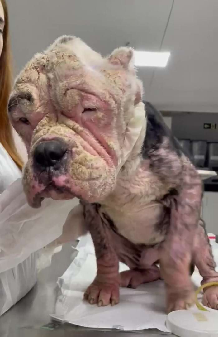Этот пёсик породы американский булли скитался по улицам Сан-Паулу, Бразилия, больной и никому не нужный, а люди лишь обходили его стороной из-за кожных заболеваний, не позволяющих собаке даже открыть глаза.