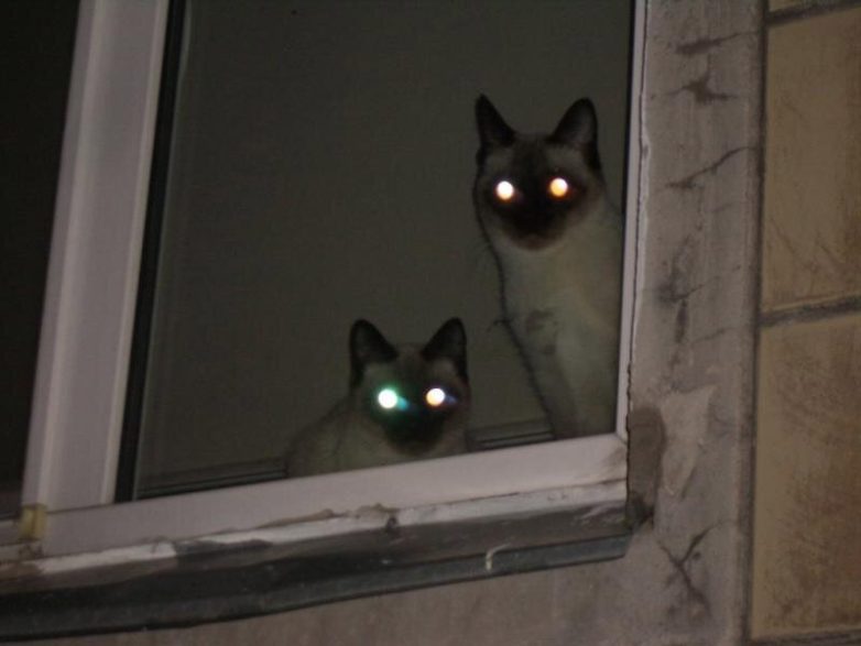 Все знают, что кошачьи глаза светятся в темноте. Вернее, что они отражают свет. Поэтому любой направленный источник света в полуночной тьме превращает глаза котиков в адские фары.